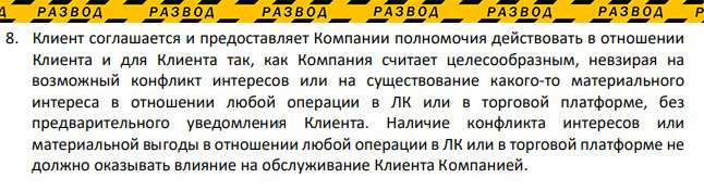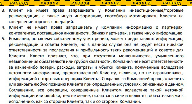 Компания отказывается вам предоставлять информацию о партнерах, с которыми она работает. Брокер запрещает пользователю запрашивать информацию, связанную с торговлей, однако сама может предоставлять торговую информацию, когда ей вздумается. При этом не несет ответственность за ваши убытки, расходы, финансовые риски.