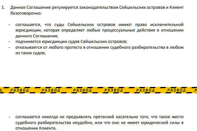 В пункте о регистрации компании указывается что клиент не имеет каких-либо претензий по поводу того, что судебные разбирательства будут происходить на территории и законам Сейшельских островов.