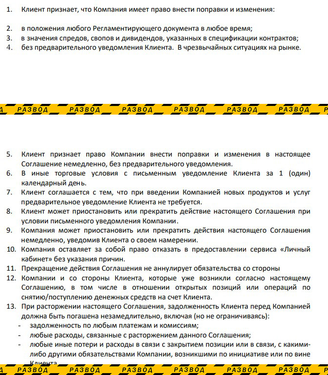 Компания без уведомления клиента может изменять положения договора, свопы и спреды.