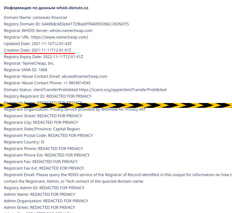 Домен сайта зарегистрирован всего несколько месяцев, хотя заявлено, что брокер существует долгое время.