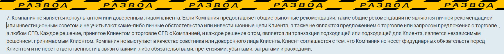 Здесь указано, что любые финансовые советы со стороны компании нужно рассматривать как рекомендации, а не призыв к действию. Но брокер предлагает вам открыть недешёвый торговый счет в услуги которого входят сигналы и работа с аналитиком. Получается этим пунктом компания снимает с себя ответственность за качество услуг, которые продает.