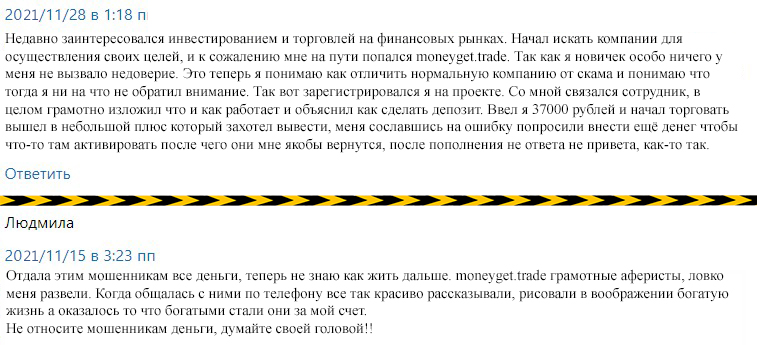 Для начала стоит сказать что moneyget.trade не выводит ваши сделки на меж банк, а является обычной кухней. Все ваши проигранные деньги осядут в карманы мошеннику. Если же вам удалось заработать, то деньги со счета вам вывести не удастся. При попытке вывести средства с вами свяжется сотрудник и сообщит об ошибке, для решения которой нужно внести ещё деньги. Отказавшись платить мошенникам, с вами перестают выходить на связь, а деньги навсегда блокируются на счету. Хоть у компании формально и существует служба поддержки, по факту она ничего не решает, а ваши письма идут в один конец.