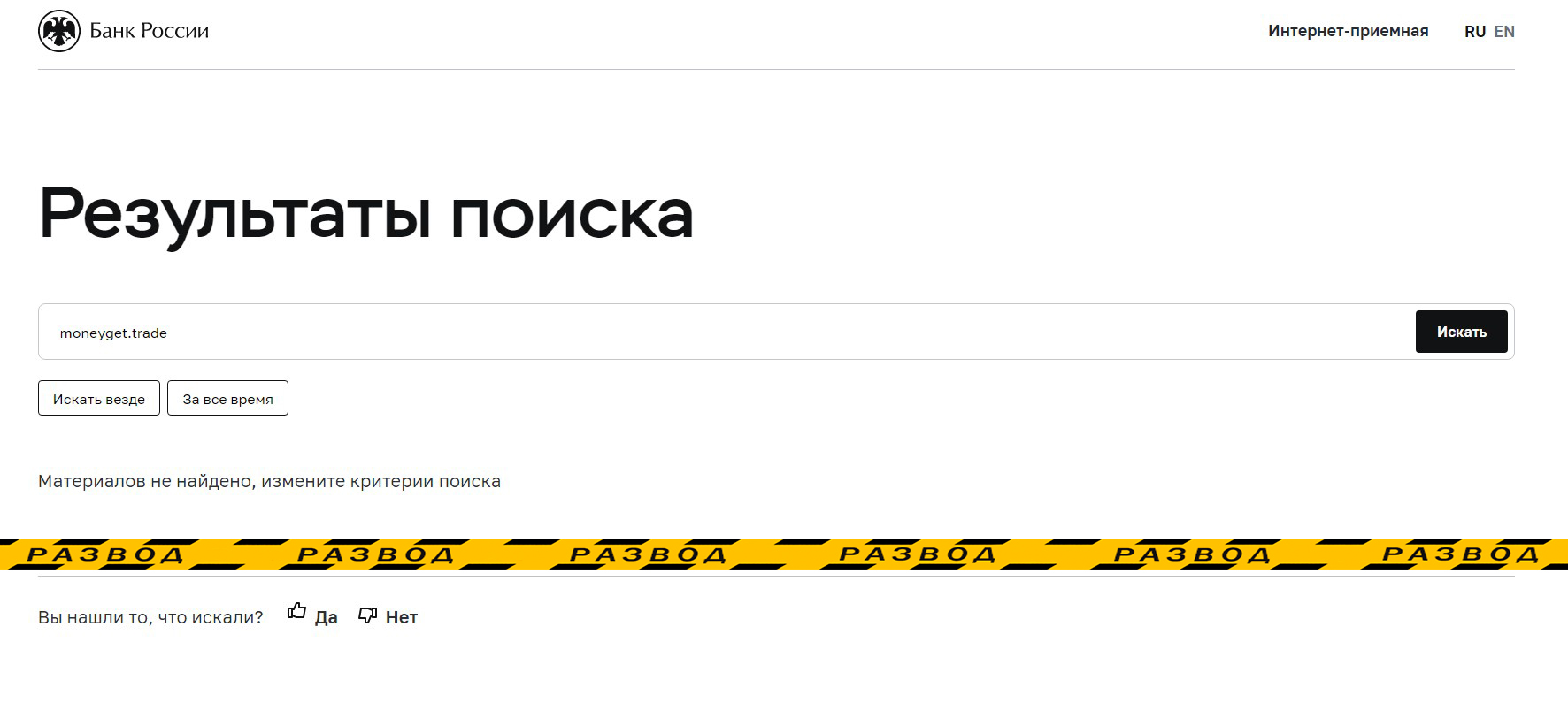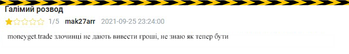 Для начала стоит сказать что moneyget.trade не выводит ваши сделки на меж банк, а является обычной кухней. Все ваши проигранные деньги осядут в карманы мошеннику. Если же вам удалось заработать, то деньги со счета вам вывести не удастся. При попытке вывести средства с вами свяжется сотрудник и сообщит об ошибке, для решения которой нужно внести ещё деньги. Отказавшись платить мошенникам, с вами перестают выходить на связь, а деньги навсегда блокируются на счету. Хоть у компании формально и существует служба поддержки, по факту она ничего не решает, а ваши письма идут в один конец.