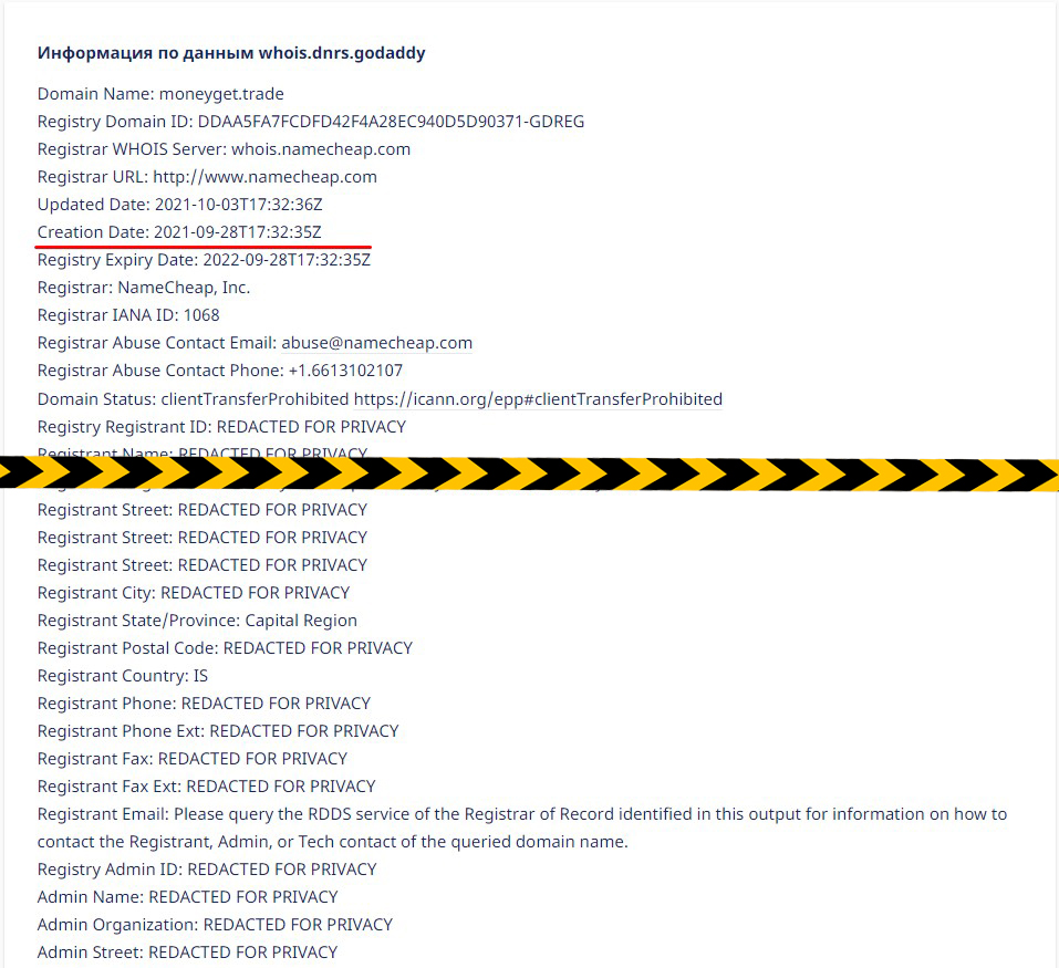 Так же с легкостью можно выяснить дату регистрации домена сайта. Мы увидим, что сайту всего три месяца, а значит доверять проекту явно не стоит.