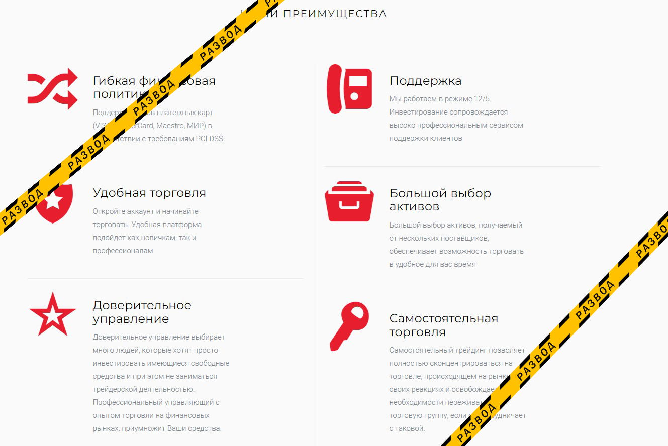 Брокер на своем сайте предоставляет лишь поверхностную информацию о компании. Вы не найдете информацию о том, когда был запущен проект, кто руководит фирмой и, кто в ней работает. Вам предоставляют лишь шесть блоков с основными услугами и преимуществами брокера. Цитата Бенджамина Франклина чтобы замотивировать пользователя, и уведомление о рисках. Больше вы не найдете информации на сайте относящейся к проекту.