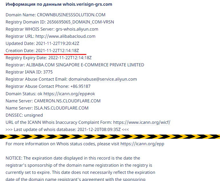 Брокер создает иллюзию надежности, старается вызвать доверие указывая на свою долгую историю. Но элементарно проверив домен, мы выясняем, компания существует с конца ноября этого года. Это мошенник, ворующий деньги.