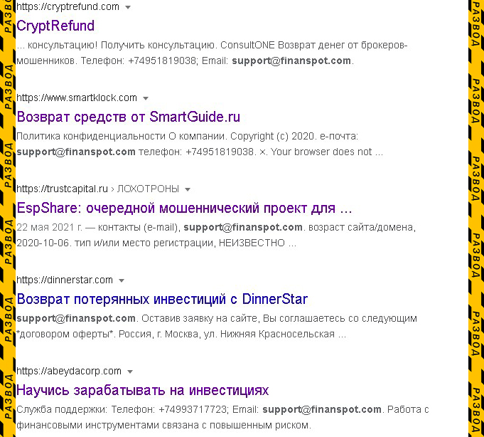 Подобных лохотронов много, но в этом проекте нас заинтересовало совершенно другое, а именно другие проекты этого лохотрона. На сайте CapitalRush указана почта support@finanspot.com. Вбиваем эту почту в гугл и находим проекты: InvestLiveStyle(investlivestyle.com), Инвестиции в воду(abeydacorp.com), xCyberStar(xcyberstar.com), RealInvestRush(realinvestrush.com), SmartGuid(www.smartklock.com), CryptoRefund(cryptrefund.com). Некоторые проекты предлагают вернуть средства от брокеров и мошенников, а другие наоборот их вложить.