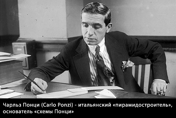Американец итальянского происхождения Чарльз Понци (1882—1949) — основатель финансовой пирамиды по «схеме Понци», при которой проценты по инвестициям выплачивались за счет притока новых клиентов. Его компания выдавала долговые расписки, в которых обязывалась выплатить на каждые полученные $1000 — $1500 через 90 дней. Пирамида рухнула летом 1920 года вследствие иска одного из вкладчиков, который потребовал 50% прибыли от компании Понци. Последний приостановил прием вкладов, из-за чего вкладчики ринулись забирать деньги, что привело к банкротству компании. В итоге Понци был осужден на 5 лет.
