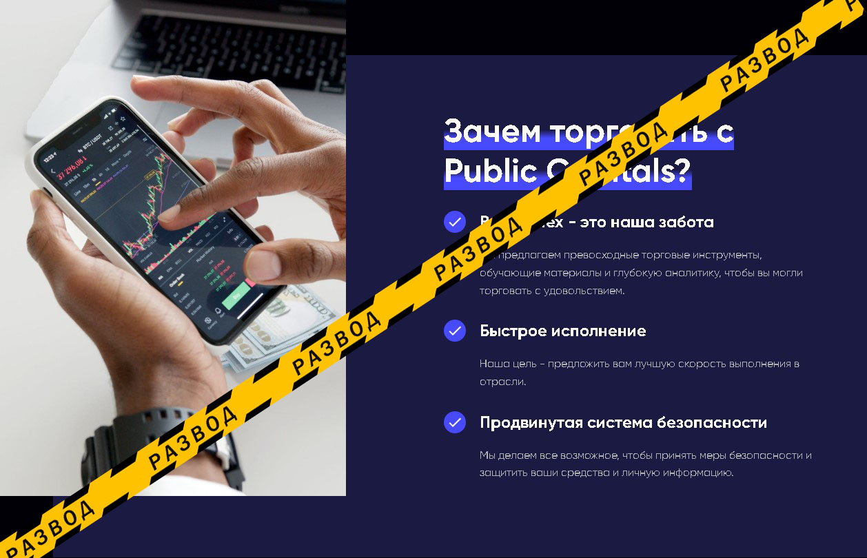 Public Capitals – международная брокерская компания, цель которой обучить новичков профессиональной торговле на финансовом рынке, а опытным пользователям предоставить удобную платформу для трейдинга. С Public Capitals Вы сможете торговать более чем 200 финансовыми инструментами форекс и CFD, включая валютные пары, акции, криптовалюты, сырьевые товары и глобальные индексы. Опытные сотрудники, которые упорно работают над проектированием, разработкой и улучшением торговой платформы, чтобы обеспечить непревзойденное качество обслуживания клиентов, благодаря которой Вы сможете торговать в безопасной и прозрачной атмосфере. По крайней мере именно так написано на сайте компании.