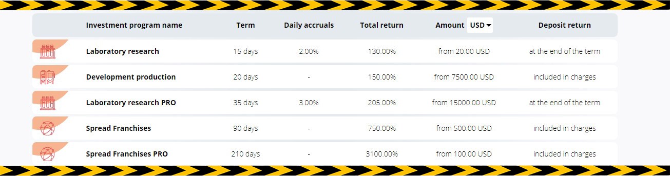 - Разработка продукции –срок инвестирования 20 дней, прибыль до 50%.
