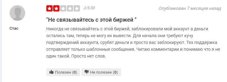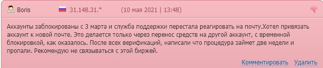 С 2020 года в интернете начали всплывать жалобы на криптобиржу. В отзывах в один голос заявляют о том, что компания закрывает счета клиентов. Или выдает баны без причин. Разумеется счета на которых остался не малый баланс в криптовалюте.