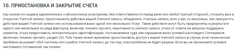 - Закрывает счет клиента если пользователь чем то не понравился поддержке или сотрудникам компании. Восстановить такой счет и вернуть деньги очень сложно.