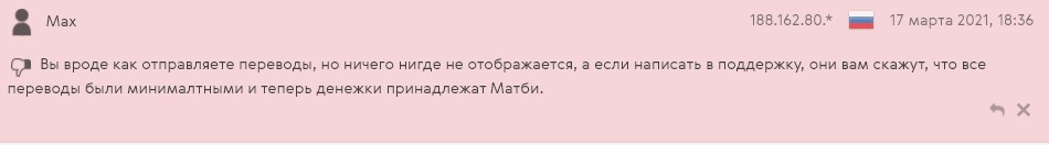 Обман на высоких комиссиях — это то, на что чаще жалуются в отзывах на Матби.