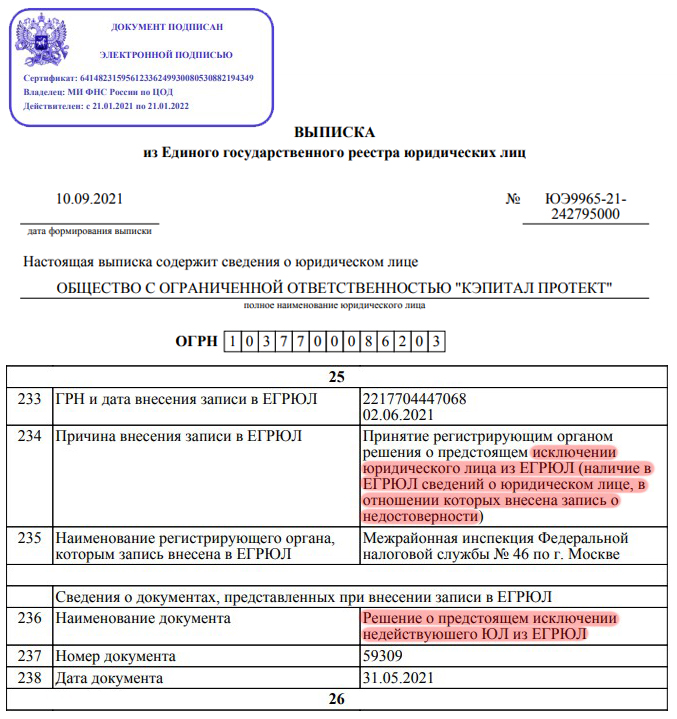 Характеризует организацию и то обстоятельство, что операции по счетам ООО «Кэпитал Протект» приостановлены. Кроме этого Capital Protect не сдает налоговою отчетность, а в реестре юр. лиц указан недостоверный юридический адрес. На основании вышеперечисленного, регистрирующим органом принято решение об исключении юридического лица ООО «Кэпитал Протект» из ЕГРЮЛ.