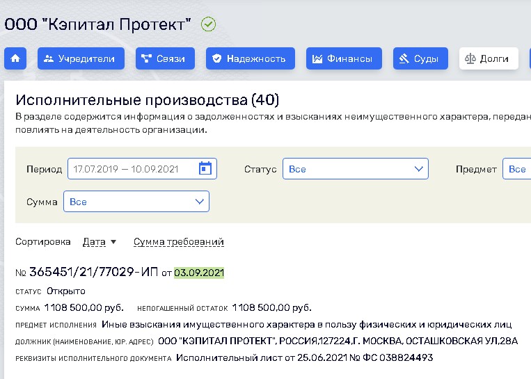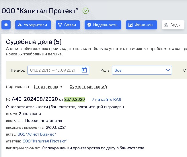 Кроме этого есть данные о пяти судебных делах с участием ООО «Кэпитал Протект». Наличие арбитражных производств указывает на проблемы с контрагентами и государственными органами.
