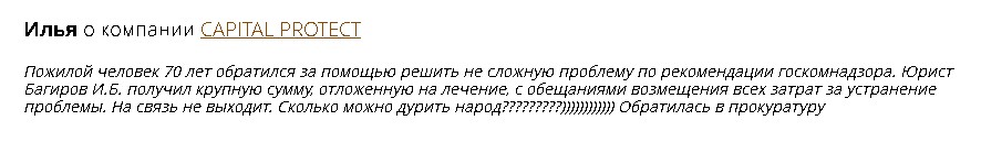 И конечно, самую большую ценность представляют отзывы людей, которые доверили Capital Protect представлять свои интересы в различных инстанциях. Получилось ли у них отстоять свою правоту? Как зарекомендовали себя эксперты в области права из Capital Protect не на словах, а на деле? Об этом мы можем судить по их отзывам. В сети найти которые не составит большого труда. Здесь же мы публикуем некоторые из них. Надеемся наш обзор в случае необходимости поможет вам принять верное решение.