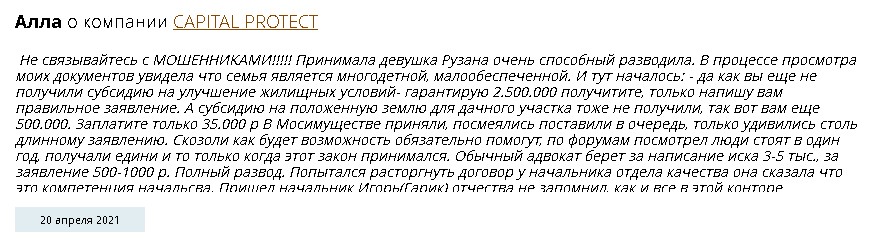 Судя по отзывам, сложилось мнение, что главная задача юристов Кэпитал Протект — развести пришедшего клиента на деньги. Никакой работы по деду доверителя вестись не будет. Ну кроме дальнейшего развода на деньги.