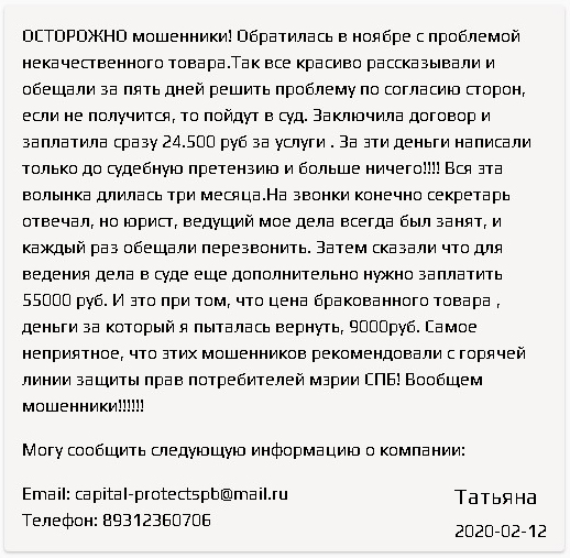Я заплатил крупную сумму денег за то, чтобы «специалисты» из кэпитал протект скопировали пару статей закона. Причем в личных данных типа ФИО и сумм умудрились сделать четыре ошибки. Видимо сотрудников набирают после 9 класса общеобразовательной школы. Большего образования для работы в Кэпитал Протект не нужно.