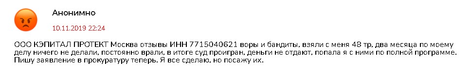 Мне кажется хватит просто писать отзывы о Кэпитал Протект. Нужно подать коллективную жалобу о ненадлежащем выполнении своих обязанностей в Роспотребнадзор и в московскую коллегию адвокатов.