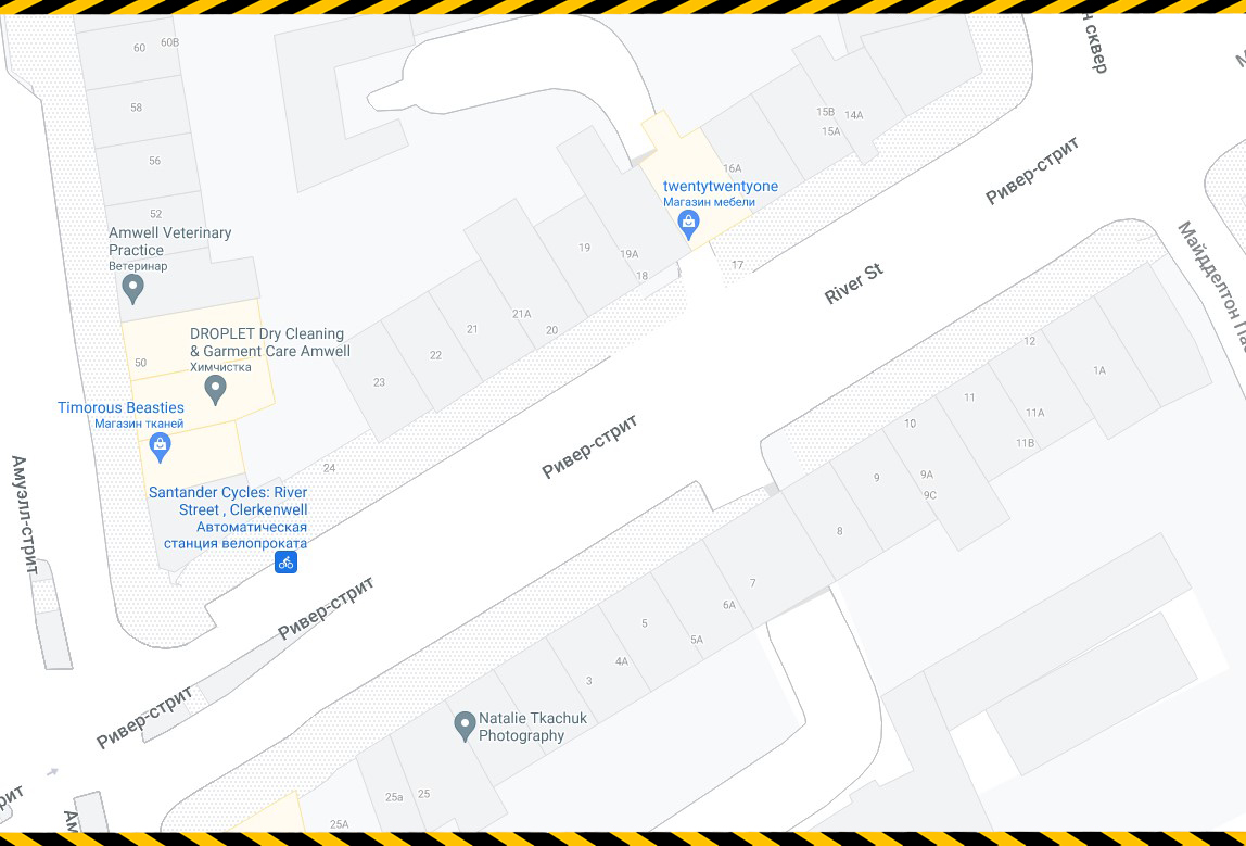Компания FinancialCo находится по адресу Великобритания, Лондон, улица Ривер стрит 32, 11, GB-019. На картах такого адреса нет. Такого дома еще нет. Нумерация улиц заканчивается на 25-ом.