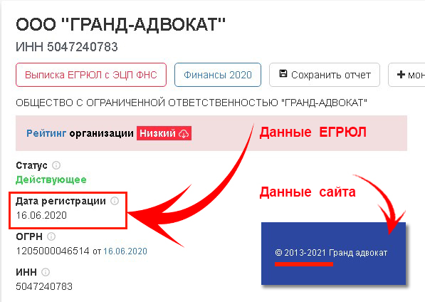 На своем сайте компания указывает датой основания 2013 год. Согласно реестру юридических лиц, ООО «Гранд-Адвокат» зарегистрировано 16 июня 2020 года по адресу 141704, Московская область, город Долгопрудный, Московское шоссе, дом 55 корпус 1, квартира 180. Всего один год назад. Налицо попытка ввести в заблуждение клиентов, предоставив недостоверную информацию.