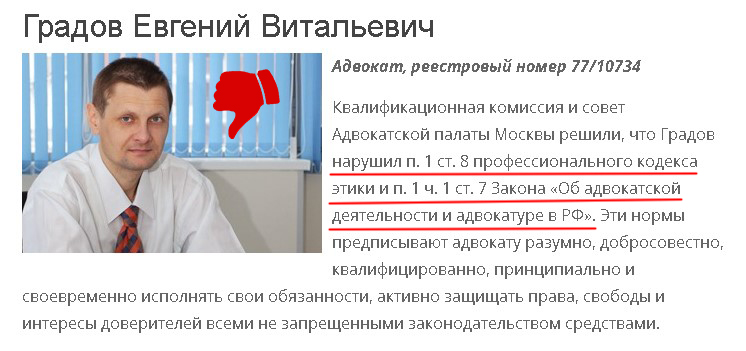 Отдельного внимания заслуживает адвокат Градов Евгений Витальевич, реестровый номер 77/10734. Федеральная палата адвокатов (ФПА) включила Градова в черный список адвокатов за нарушение Закона «Об адвокатской деятельности и адвокатуре в РФ».