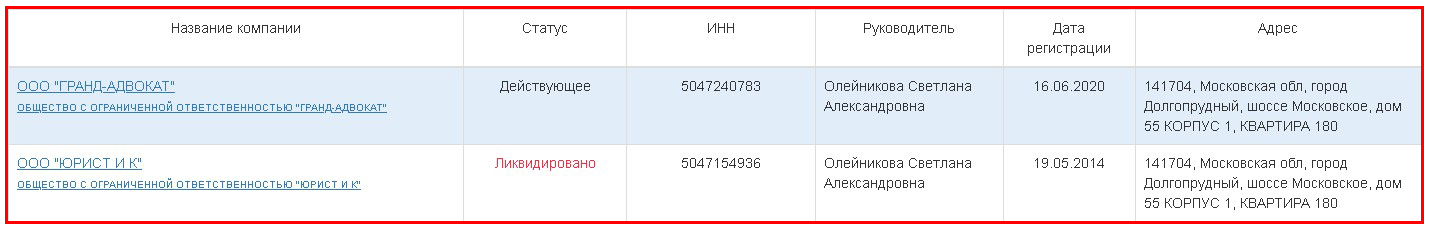 Для Олейниковой С. А. это не новый бизнес. В 2014 на неё была зарегистрирована компания ООО «ЮРИСТ И К», которая 24 декабря 2018 года была ликвидирована. На месте ликвидированной компании через полтора года создано новое ООО, полностью идентичное прежнему. Для чего понадобилось полностью менять название и реквизиты компании мы можем только догадываться.