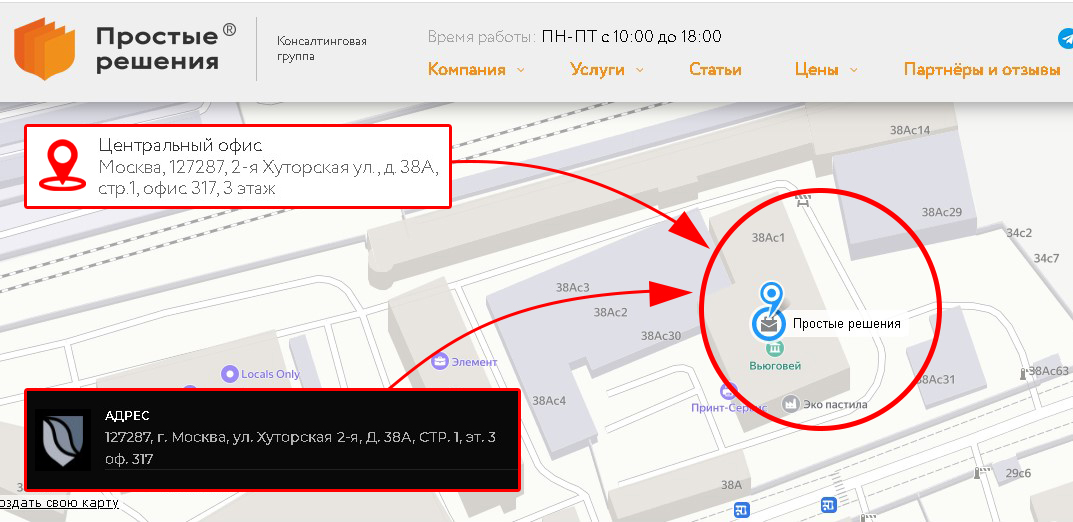 В футере сайта lawxpert.net указаны ИНН и ОГРН компании. Проверив эти данные на сайте rusprofile.ru, мы получили следующую информацию: ООО «ЮК «Приоритет» ИНН 7713462314 ОГРН 1187746884247 зарегистрировано 19.10.2018 по юридическому адресу 127287, город Москва, Хуторская 2-я ул, д. 38а стр. 1, этаж 3 офис 317. Руководителем является генеральный директор Кий Николай Васильевич (ИНН 325401071288). Этот же адрес указан и на сайте компании lawxpert.net. Вводим этот адрес в поисковую строку браузера и получаем ссылку на сайт некой юридической компании «Простые решения» (easylex.ru). ЮК «Простые решения» по стечению обстоятельств находится в Бизнес-центре «БАШИЛОВСКИЙ ДВОР» по такому же адресу, что и Lawxpert / Приоритет. Совпадает всё, вплоть до номера офиса. Так как на сайте найденной компании «Простые решения» нет вообще никаких регистрационных данных, ни ОГРН, ни ИНН, то на сайте rusprofile.ru пробуем найти ее по названию. Но такой компании не зарегистрировано. Что мы имеем? В одном офисе с ЮК Lawxpert / Приоритет находится компания-призрак «Простые решения». Очевидно, что это одна организация, которая при необходимости использует либо одно, либо второе название. В каких случаях может понадобиться скрывать название компании и прикрываться несуществующей фирмой? Правильно! В случае незаконной деятельности или мошенничества!