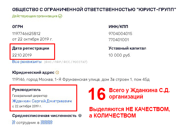 Каждый год юрлица и ИП до 01 июля должны предоставлять в Федеральную налоговую службу сведения о численности работников и налоговую отчетность за прошедший год. Эти сведения ФНС вносит в Единый реестр субъектов малого и среднего предпринимательства. За ШЕСТЬ месяцев ООО «Юрист-Групп» не смогли предоставить такие данные в налоговый орган. Что наглядно демонстрирует халатное отношение к выполнению обязательств. Это уже третье предприятие Сергея Жданкина, которое так безответственно относится к отчетности. Первые два были позорно ликвидированы. Такая же участь ожидает и Юрист Групп.