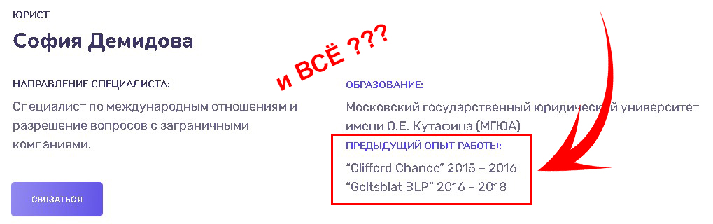 Судя по информации на сайте, стаж работы юристов из Юрист Групп по одному — два года в разных компаниях. Дольше на одном месте ребята не задерживались.