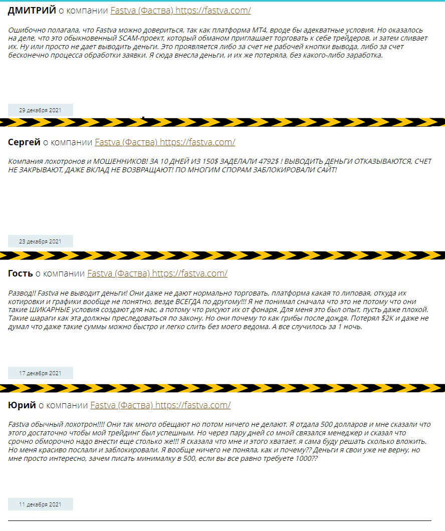 Трейдеры уже потеряли свои деньги с мошенником fastva, сберегите свои средства вы! Вот лишь некоторые отзывы людей, которым удалось посотрудничать с брокером.