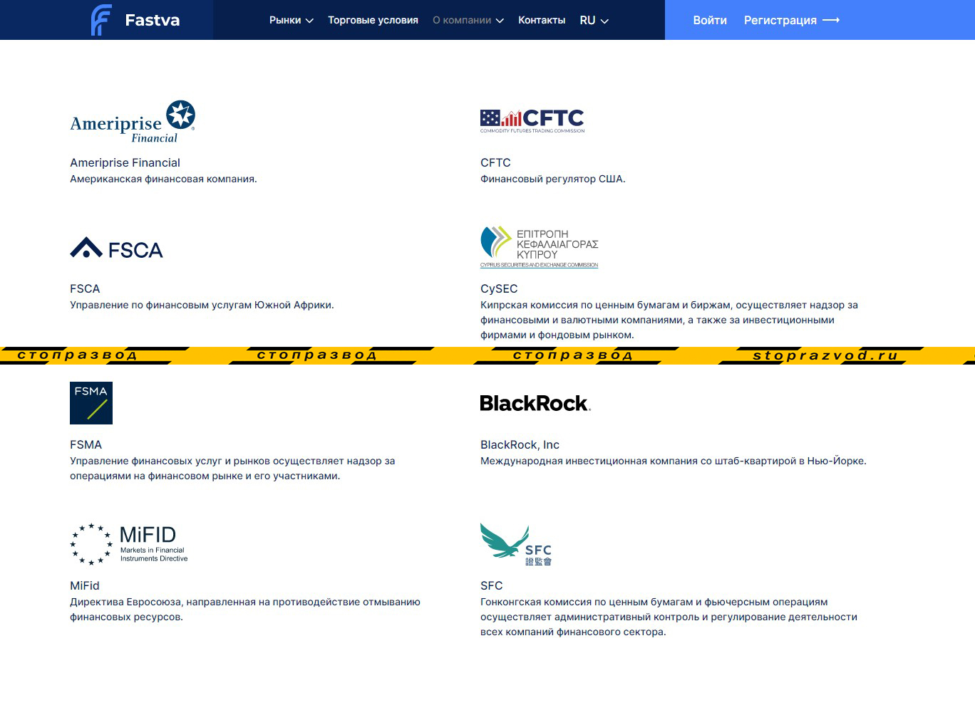 Брокер fastva без скромности разместил целых 8 логотипов различных регуляторов у себя сайте, только вот забыл предоставить сами лицензии у себя на сайте. Админы надеялись, что люди поверят им на слово.