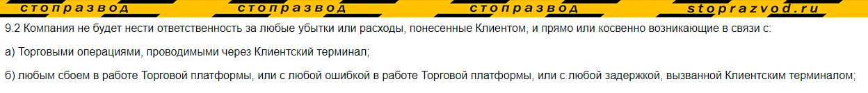 Брокер не несет ответственность за убытки, которые вы понесете. При этом речь идет не о рыночной торговле, где и вправду трейдер берет на себя риски, а об ошибках в терминале и системе. Компания снимает с себя ответственность за то, за что прямо должна отвечать.