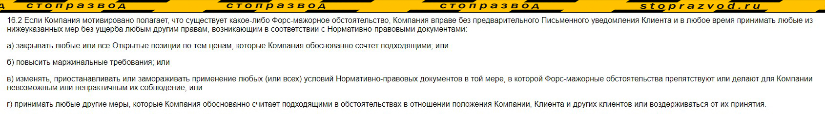 Здесь fastva указывает что в случае форс-мажорных обстоятельств она может закрыть ваши сделки и прекратить с вами сотрудничество без объяснения. Только проблема в том, что она не дает определения этим обстоятельствам, а значит под них может подвести что угодно.