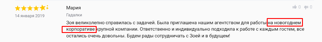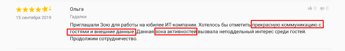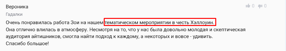 Да у Зои Галочки имеется значительная часть положительных отзывов, но не как маг и гадалка. А как аниматор и веселая ведьма, призванная разбавить праздничный вечер своим присутствием. Судя по отзывам артист из Зоечки весьма сносный. Молодец, хлеб свой отыгрывает.