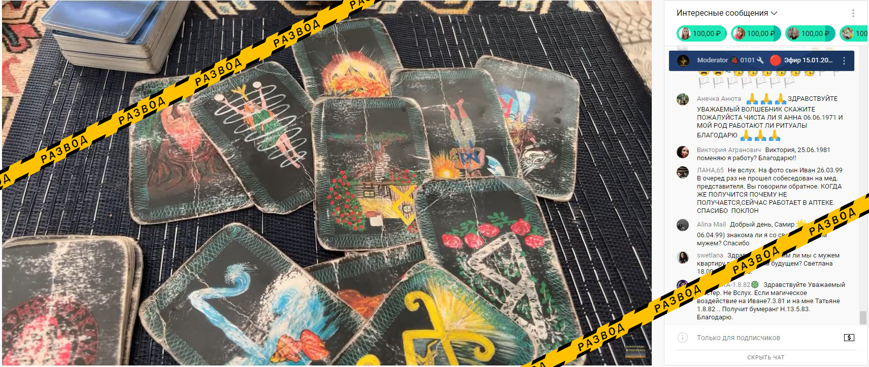 Видео на ютубе, основная деятельность Самира. Там он собирает донаты, и практически каждый день выпускает видео, с ритуалами которые по все видимости придумывает сам. Свое лицо он к сожалению, не показывает, правда оговорился в одном из видео что на одном из новогодних стримов все же показал кто он. Но в целом свое лицо он скрывает. Ведь так намного проще заниматься мошенничеством.