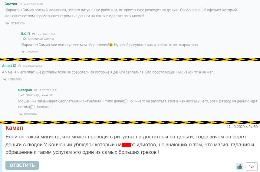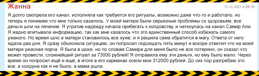 Маг Самир Али предлагает свои ритуалы для того чтобы облегчить ваше существование, исполнить ваши желания, приворожить нужного человека. Конечно подобные ритуалы не работают априори, но к сожалению некоторые люди продолжают верить во всевозможных магов и колдунов. В этом обзоре вы поймете почему Самир Али не какой не маг, а жулик и мошенник.