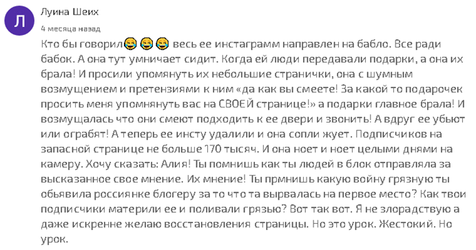 После прочитанных отзывов об Алии Байтугаевой, можно несомненно удостовериться в мошеннических замыслах блогерши. Будьте бдительны и фильтруйте полученную информацию от любых блогеров.