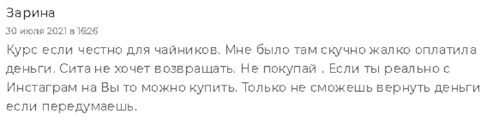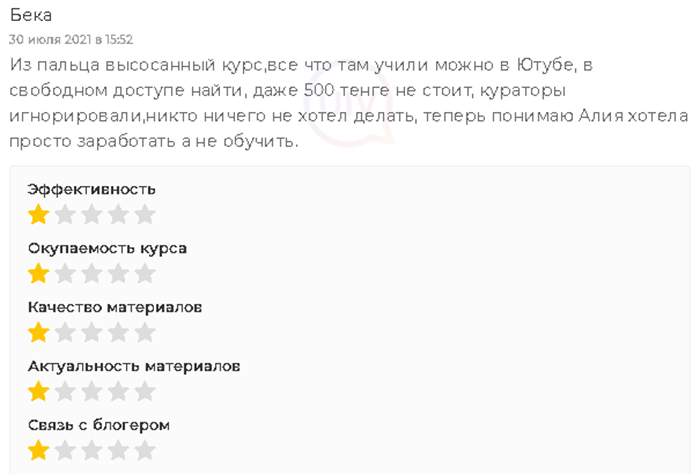 Большинство клиентов пишут реальные отзывы о курсе Алии Байтугалиной, но многие отзыв-сайты покупает сама блогерша, что придает её курсу большей значимости. Предоставляем некоторые комментарии клиентов для рассмотрения: