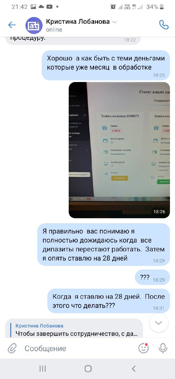 Мне оказывают помощь, вернуть затраченное деньги, я благодарна друзьям в оказанном действии… Долг нужно вернуть, в большой или малой сумме, с чем я полностью, мошенников нужно разоблачать, которые наживаются за счёт своих клиентов…