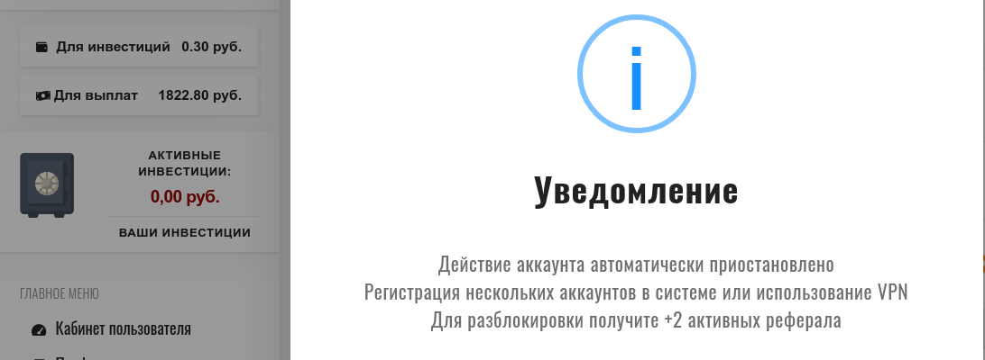 Данная кантора не выводит деньги. Вложил 2 500 рублей для старта, после прочтения множества положительных отзывов. Денег нет, как и моего аккаунта. Подденржка ответила, сказали, что нет такого пользователя и суммы такой внесено не было. Кто сталкивался с этой айферой?Как врнуть деньги и реально ли? Не советую закидывать даже 100 рублей. Так как чаще всего маленькие суммы срабатывают, что вызывает доверие пользователя, таким образом он вкладывает крупные суммы и остается ни с чем.