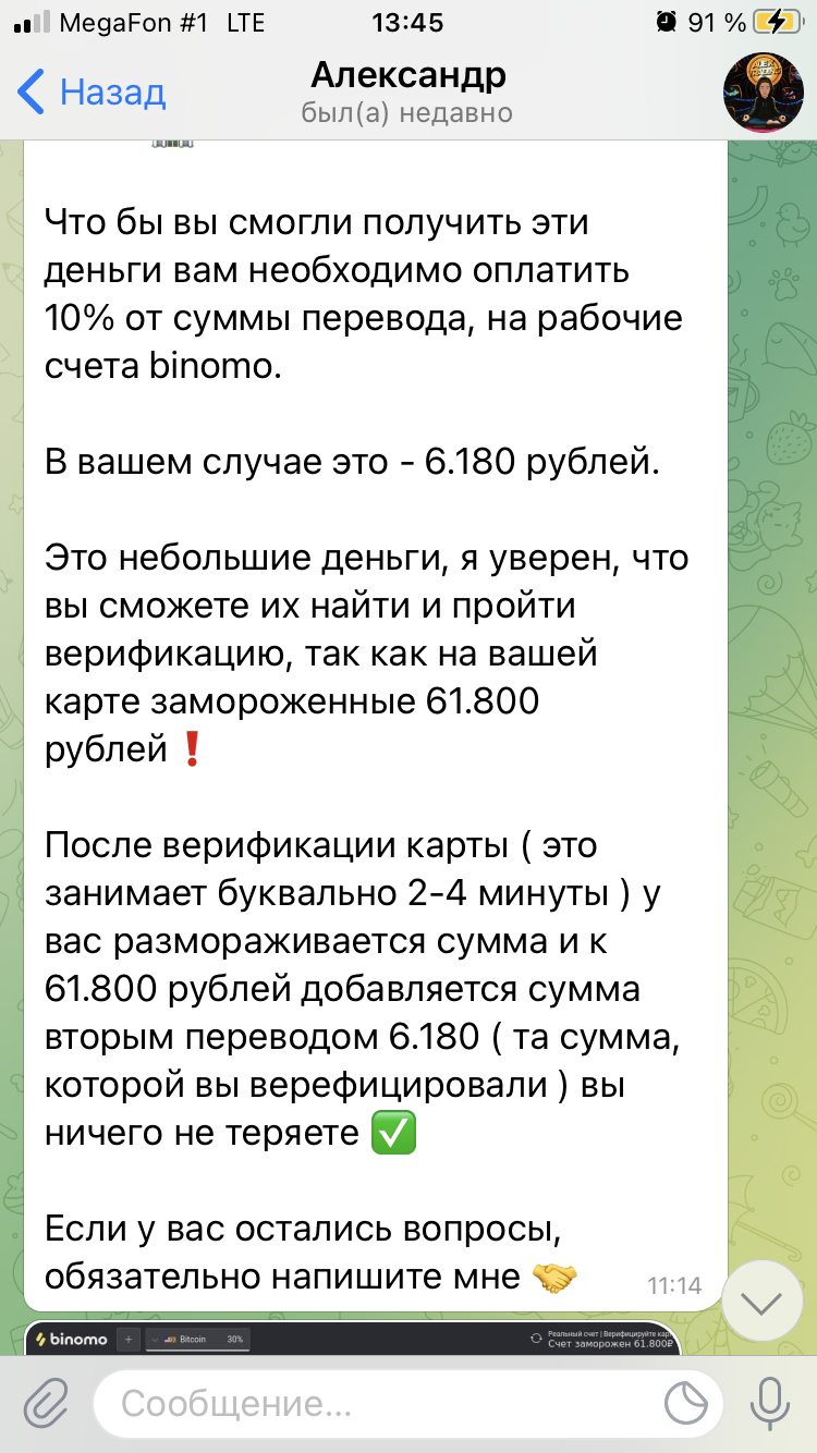 @alex_tradeing. В профиле этого человека было написано 1500 переводишь , а утром он выплачивает прибыл наступило утро ни денег ни прибыли .Только началось самое интересное что надо перевести ещё 6000 чтобы якобы пройти верификацию так как счёт заморозили.