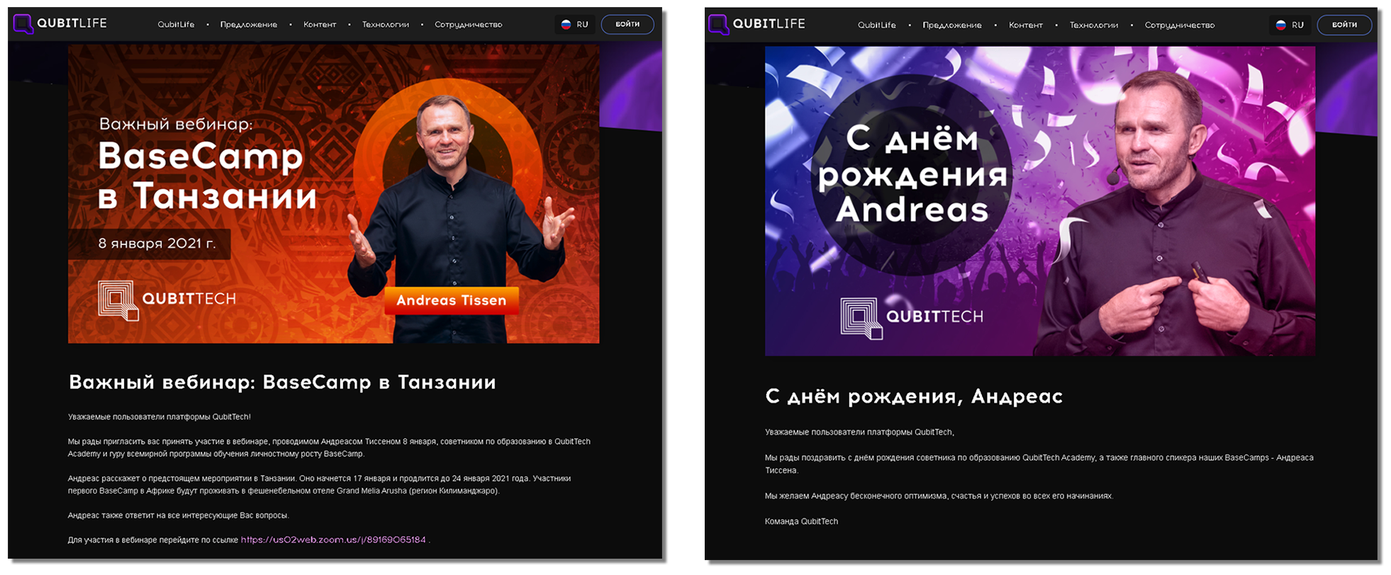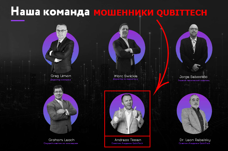 Впрочем, совсем заниматься бизнесом Андреас Тиссен (Andreas Tissen) не перестал. Оратор занимает должность советника по образованию в компании QubitTech (смотри наши прошлые обзоры на них). Если кто не знает, QubitTech, он же QubitLife — это финансовая пирамиды, мошенники которой продавали людям некую цифровую лицензию, которая должна была приносить владельцу огромную прибыль. Как объясняют сами мошенники, они якобы занимаются квантовыми технологиями и инвестируют деньги клиента в свой бизнес. На деле ни каким бизнесом QubitTech и QubitLife не занимаются, а все деньги идут в карман организаторов, в том числе и в карман Андреаса Тиссена.