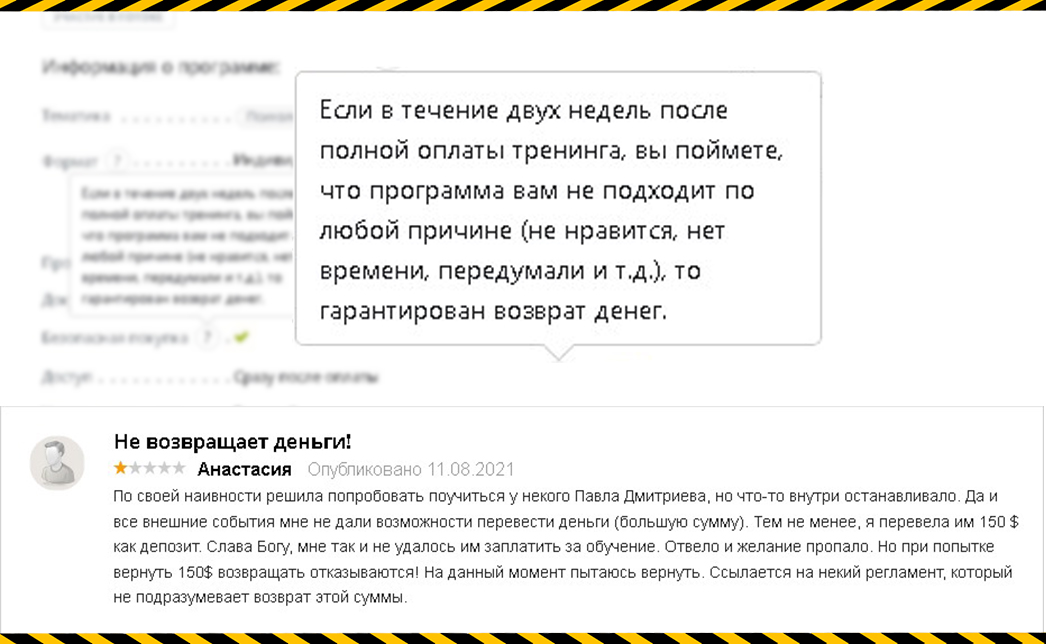 На сайте несколько раз указывается такая функция, как «возврат денег» или «персональная гарантия от Павла Дмитриева». В ней говорится, что если вы недовольны программой, то значит, что вам эта информация еще не нужна. Читаем между строк: значит вы не повелись на наш лохотрон. На деле же ничего не возвращают. Об этом свидетельствует много отзывов, жалоб от кинутых людей.