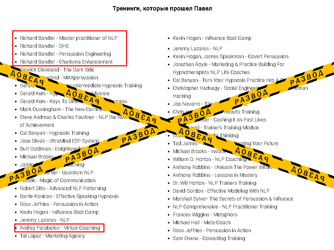 Мы уже обсудили, что никакого диплома образовательного у Павла не обнаружилось. Но был человек в его жизни, который все поменял. Известный коуч, родитель данной сферы – Андрей Парабеллум. Даже сайты у них схожи по конструкции, вдохновились.