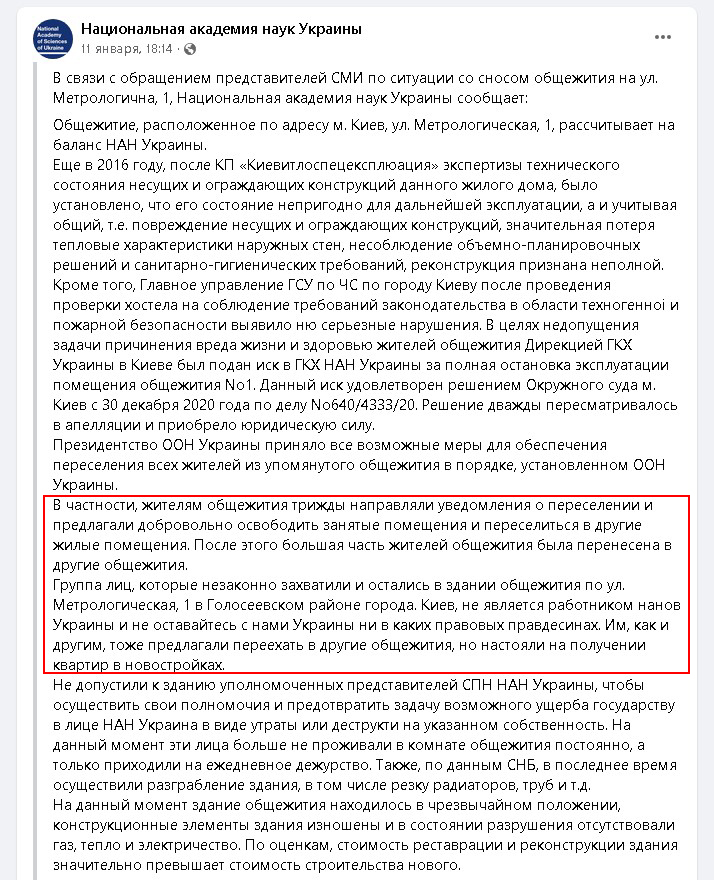 Администрация академии утверждает, что предприняты все возможности для переселения жителей. Людей предупреждали трижды, предлагали переехать в общежитие. Также НАН сообщает, что жители переехали, а тех, кто там остался, они не знают.