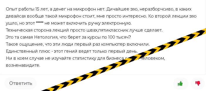 Все тут правда написана! Преподов не знаю где нашли, ничего не могут объяснить. Как их вообще допустили преподавать? Дают размытые ответы, да я и сам такое мог ответить, мне бы конкретики, а ее нет. Дз не проверяют, сказали ничего не пришло, хотя я все отправлял и по несколько раз. Какие-то детские отмазки! Заплатил 100к, лучше бы смыл в унитаз