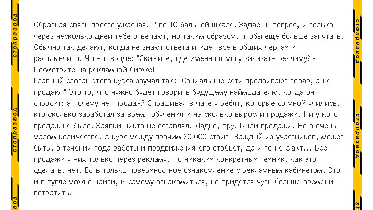 На экспертов жаловалось очень большое количество людей. И то, что преподаватели не отвечают на вопросы или делают это очень расплывчато, никуда не девается. Обычно так говорят, когда не знают ответа, поэтому все сказано в общих чертах. Например, ваш ученик Игорь, который купил курс SMM-менеджера спрашивал: «Где можно заказать рекламу?». На что ему поступил ответ: «Посмотрите на рекламной бирже». Это ли не доказательство некомпетентности экспертов курса? Причем на этом же курсе была оскорблена девушка, которая, как и все купила его по полной стоимости. В достаточно грубой форме преподаватель пошутил о религии ученицы. С чего делаем выводы не только о профессионализме, но и о тактичности ваших экспертов.