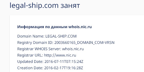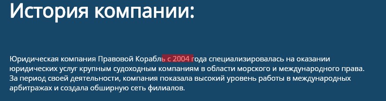 Если почитать информации о компании. «Правовой корабль» заявляет, что компания работает с 2004 года. Но проверка сайта говорит об обратном —