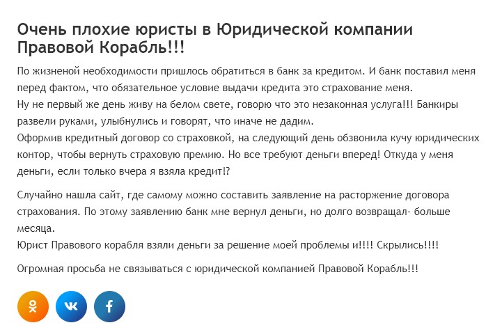 В некоторых случаях юридическая компания «Правовой Корабль» вовсе не оказывают никаких услуг. После получения предоплаты, юристы пропадают, переставая отвечать на звонки. Если обратиться заново, под новыми контактами. То снова потребуют предоплату или сразу добавят в черный список.